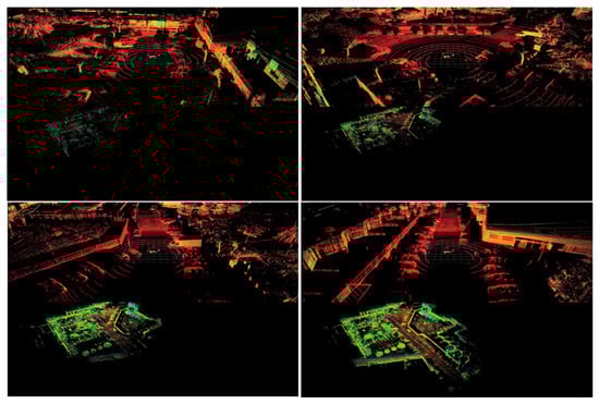 Examples of captured point cloud data and location and mapping data for a sequence of frames, where the image from the top corner is the first extracted frame and the bottom right consists of the last frame of this sequence. Every image displayed here is vertically divided into (top) point cloud provided by the LiDAR sensors and (bottom) SLAM output.