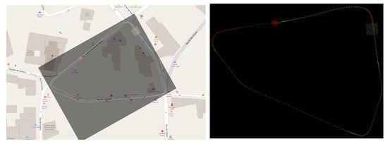 Test vehicle positions naturally evolve during a driving sequence. In some situations, rather than just constantly driving in new environments, some of the courses will feature a loop (i.e., a sequence where, during the drive, the vehicle returns to a previously visited location). In the figure presented below, such a case is demonstrated, with a snippet of a map view of the traversed area on OpenStreetMaps, a computed map and their overlap in Figure 13.