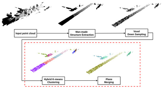 The plane segmentation procedure using the proposed system. We extract man-made structures from the unorganized input point cloud and voxelize the points using voxel down sampling as pre-processing. Then, the proposed hybrid K-means clustering method segments the point cloud into planes. Finally, the merging process combines the small planes that need to be merged.