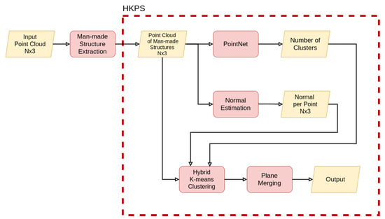 We propose a novel approach to segment unorganized 3D point clouds into planes, called hybrid K-means plane segmentation (HKPS). The whole plane segmentation procedure using the proposed system is shown in Figure 1, and the detailed plane segmentation process of HKPS is shown in Figure 2. We extracted man-made structures from the unorganized input point cloud and voxelized the point using voxel downsampling as pre-processing. The proposed HKPS involves two steps: hybrid K-means clustering and plane merging. Hybrid K-means clustering performs clustering based on K-means++ [4], which is a K-means [5]-based clustering algorithm that has the advantage of careful seeding. K-means++ requires a parameter K, which is the number of clusters. We used PointNet [6] to estimate parameter K from the point cloud. PointNet is an unsupervised learning model that uses cosine distance for training. The final plane merging step combines the small planes that need to be merged. Our code is publicly available at [7].