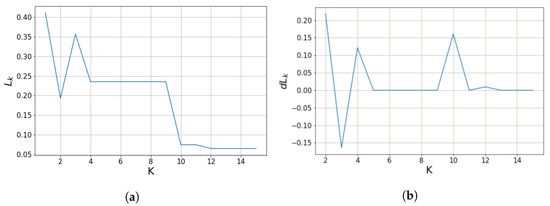 As K increases, decreases when the point cloud is divided into planes, as shown in Figure 3a. We use , which is the difference of , which can be obtained as the difference between and .