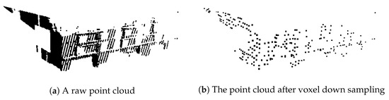 The point cloud is partially composed of different densities owing to the distance from the sensor, angle, and obstacles, as shown in Figure 4a Because hybrid K-means clustering rearranges the centroids using the center of gravity of each cluster, the centroids tend to be rearranged in the direction with a greater density of the points. To solve this problem, we perform voxel downsampling, and the result is shown in Figure 4b.