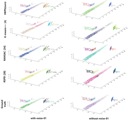 Two types of datasets are used to compare the plane segmentation performance of our proposed method, HKPS, with previous works: with-noise and without-noise datasets. The with-noise dataset is the Virtual KITTI dataset after voxel downsampling with uniform density. For the without-noise dataset, we deleted small clusters of points, such as parts of trees, vehicles, and unknown objects, from the with-noise dataset. PointNet was trained with 70 scenes from the with-noise dataset, and the performance evaluation experiment was performed with 20 scenes from each of the with-noise and without-noise datasets.