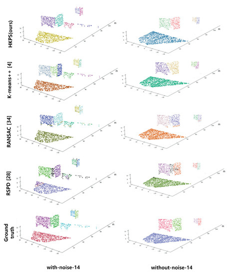 Performance comparison results using scene 14 from with-noise Virtual KITTI Dataset and without-noise Virtual KITTI Dataset. Different planes are displayed with different colors. The outliers of RANSAC and RSPD are colored in black.
