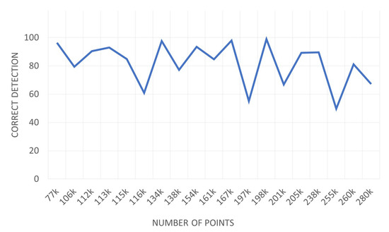 We measured the performance change with the number of points in the input point cloud. Figure 7 shows a graph of the correct detection change according to the change in the number of input points. There may be more points in the urban scene, but we measured performance using 70,000 to 200,000 points.