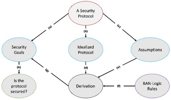 A typical BAN logic formal analysis procedure. (a) Security goals are extracted from the protocol’s security requirements. (b) The security protocol is put in idealized form. (c) Realistic assumptions about the protocol is made. (d–f) Derivation uses these inputs to derive the stated goals. (g) The security goals are checked if the derivation satisfies them. (h) Based on the results of (g), the protocol is validated as safe or not.