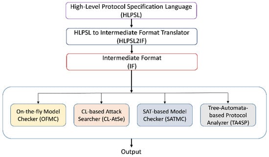 AVISPA provides a language called the high-level protocol specification language (HLPSL) [] for describing security protocols and specifying their intended security properties, as well as a set of tools to validate them formally. An hlpsl2if translates the HLPSL specification into the Intermediate Format (IF). IF is a lower-level language that is read directly by the back-ends of the AVISPA Tool. The IF specification of a protocol is then input to the back-ends of the AVISPA Tool to analyze the stated security goals. Figure 3 shows this process.