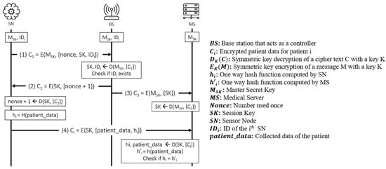 The proposed protocol [] works between the sensor nodes (SN), controller (BS), and a medical server (MS). The SNs are (implanted) medical devices that sense vital physiological information. In this protocol, a BS is only used to assist the authentication process so that the SN directly communicates with the MS after successful authentication is achieved. The protocol is executed in three stages: deployment, authentication, and data communication, as shown in Figure 12 and Figure 13 presents the OFMC and CL-AtSe back-end results of the protocol.