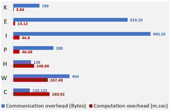 The computational and communication overheads, in terms of time, to perform the cryptographic operations (such as the number of signatures, symmetric, and asymmetric key encryption and decryption, hash functions, and XOR operations) [,,], and size of the messages communicated [,], respectively, are shown in Table 5, Table 6, Table 7 and Table 8. The comparison of protocols concerning computational and communication overheads is depicted in Figure 17.
