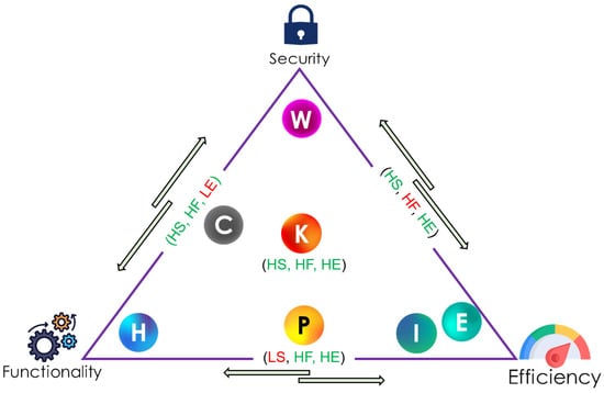 The comparison metrics—security strength, functionality, and efficiency—can be collectively used to understand better these schemes regarding security, competence, and capability. Such comparison can be best described in a triangular graph, as shown in Figure 18.