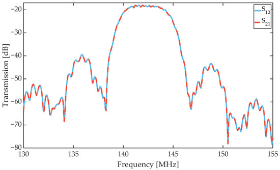 The SAW sensors used for this work are based on the above-mentioned ST-Cut quartz and have two SAW sensors with independent delay line on a sensor chip of size 14 mm × 8.9 mm. The single sensors have two pairs of split finger IDTs with a periodicity of 28 µm and Figure 2 shows the scattering parameters (S12 and S21) for a sensor used in this publication. The center frequency is at 142.5 MHz. All sensors investigated show similar scattering parameters in the range between 141 MHz and 146 MHz. The variance of the center frequency is due to thickness differences in the SiO2 wave guiding layer.