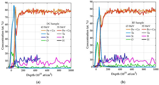 (a,b) ERDA depth profile of FeCoSiB deposited with DC and RF. The samples consist of a 5 nm Cr/400 nm FeCoSiB/10 nm Ta layer. The tantalum layer serves as a protection layer to prevent oxidation. The displayed measurement depth range corresponds to approximately 120 nm. As indicated, two different accelerating voltages 43 MeV and 35 MeV were used to obtain optimal results for all elements.
