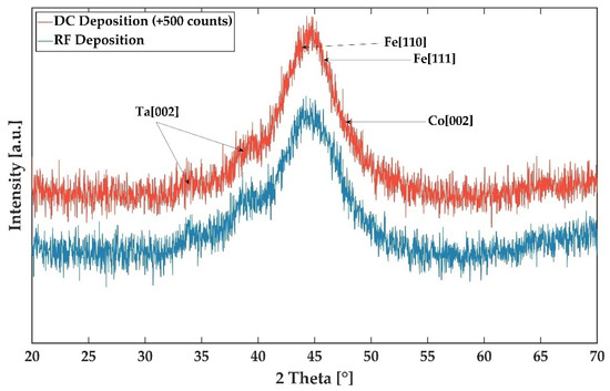 XRD result of Ta/FeCoSiB thin films deposited by RF and DC mode at 2.5 × 10−3 mbar and 2.0 × 10−3 mbar, respectively. For both deposition processes, the power was set to 200 W at an Ar flow of 40 sccm. Grazing incidence XRD was used with 2 Theta ranging from 20° to 70° with steps of 0.25°. For a better representation, an offset for the XRD result for the thin film deposited by DC mode was used. The adhesion promoter tantalum and a signal combination of the amorphous FeCoSiB are noticeable.