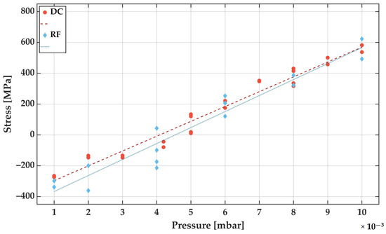 Determined film stress measurements for depositions performed with DC (red) and RF (blue) with different Ar deposition pressures. The resulting FeCoSiB film thickness was set to 200 nm and the initial and resulting bending is measured with a laser confocal microscope. The film stresses are calculated by the Stoney equation from the curvature of the cantilevers before and after film deposition. (The data are fitted with a simple linear regression).