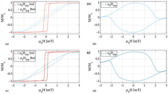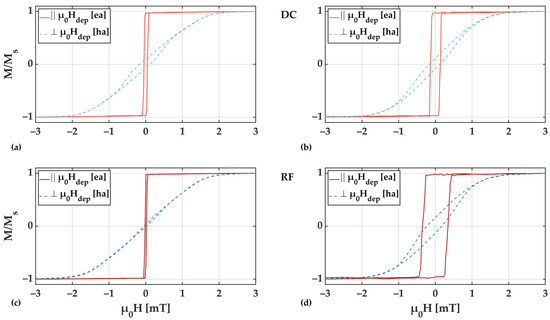 Magnetization curves for 200 nm thick FeCoSiB films deposited with DC (a,b) and RF (c,d) at an Ar deposition pressure of 2.0 × 10−3 mbar (a,c) and 8.0 × 10−3 mbar (b,d) measured along and perpendicular to µ0Hdep, respectively along the presumed easy axis (ea) and hard axis (ha) of magnetization. The measured area of 5 mm × 5 mm was set to the sample center to avoid edge effects. The measurement field was applied parallel (red) and perpendicular (blue) to µ0Hdep.