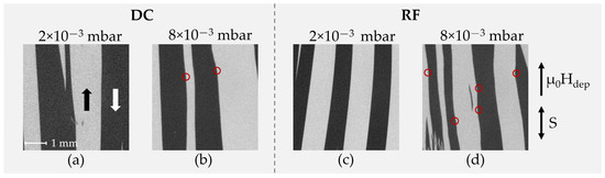For both deposition pressures the formation of large and well-aligned magnetic domains becomes visible. In contrast to the 2.0 × 10−3 mbar samples, the 8.0 × 10−3 mbar samples show areas of local domain wall pinning (red circles in Figure 7), which are particularly evident for the case of RF deposition. This is an indication of magnetically active defects, which are related to magnetic property inhomogeneities. The domain wall pinning becomes also visible during the magnetization reversal along the magnetic easy axis (not shown). It is directly reflected in the variations seen in the magnetization loops (Figure 6). Considering the high tensile stresses, the presumed magnetic property variations are assumed to be due to local magneto–elastic interactions, which directly influence the magnetic behavior [31]. The exact nature of the defects cannot be concluded from our measurements.