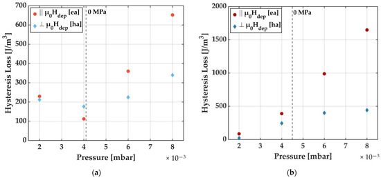 An accurate parameter to quantify the change in the magnetization loops is the hysteresis loss. The hysteresis loss is especially important as it is strongly connected to the exhibited magnetic noise in magnetoelectric composite magnetic field sensors [32,33,34]. Data for the whole parameter range are displayed in Figure 8a for DC and Figure 8b for RF deposition for Ar deposition pressures ranging from 2.0 × 10−3 mbar to 8.0 × 10−3 mbar. A saturation magnetization of Ms = 1193 kA/m [35] was assumed for the extraction from the MOKE loops.