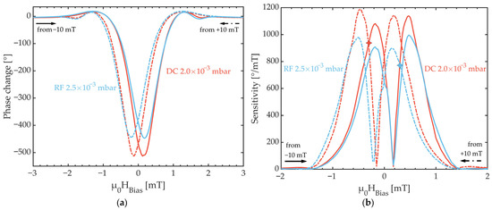 In Figure 11b, the measured sensitivity, i.e., the derivative of the phase change, shows two characteristic sensitivity maxima for each measurement direction and each sensor. The maxima indicate the positions of the highest slope in the static bias curves in Figure 11a. These points of highest sensitivity for the RF deposition case are at −0.175 mT and +0.475 mT coming from negative saturation with maximum sensitivities of 907°/mT and 996°/mT, respectively, and at +0.15 mT and −0.5 mT coming from positive saturation with maximum sensitivities of 900°/mT and 978°/mT, respectively. For the DC deposited films, these respective points are at −0.175 mT and +0.475 mT coming from negative saturation and +0.175 mT and −0.475 mT coming from positive saturation with sensitivity of 1081°/mT, 1138°/mT, 1144°/mT and 1188°/mT, respectively. The slight differences in total phase change and sensitivities originate from slightly varying FeCoSiB thicknesses [9] and tilted orientation of magnetic anisotropy [8]. However, the values presented here are in good agreement with previously published results covering a sensitivity range from 500°/mT to 2000°/mT [5,8,9,32].