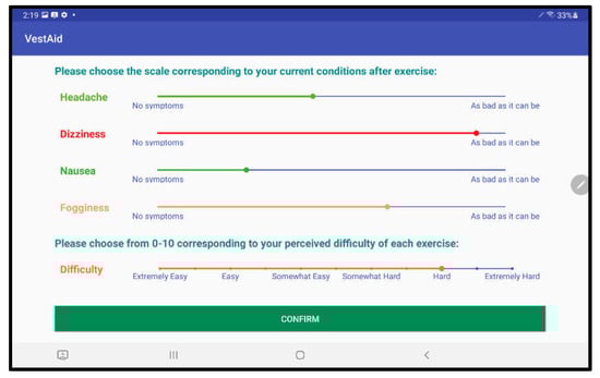 When patients log in to the app, they are taken to a start page that displays the summary of the prescribed exercises (Figure 2). From there, they can view a video that communicates instructions and demonstrates the exercises (Figure 3). Tapping on the exercise icon will take the patient to a page, in which they rate their pre-exercise dizziness, headache, nausea, and fogginess symptoms on a continuous scale of 0 (no symptom)–10 (as bad as it can get) based on the VOMS system of symptom rating [] (Figure 4). Then, the patient is taken to the exercise screen with the background scene displayed using the patterns and contrasts set by the PT (Figure 5). After completing the exercise, the patient is led to a post-exercise screening page (Figure 6), in which they rate their post-exercise symptoms (similar to pre-exercise symptom rating), as well as the perceived difficulty, using a discrete scale of 0 (extremely easy)–10 (extremely hard) that has been validated by Robertson et al. ([,]). The patient is then presented with a feedback page with a performance and compliance reward summary (Figure 7). During the course of therapy, it is natural for patients to experience difficulty, in order for the rewards to not directly depend on an ideal performance. Instead, the patients are rewarded for various aspects of performance in order that every user will earn some reward so long as they attempt the exercise. Each patient will receive 5 virtual coins for completing the exercise, 0 to 5 coins based on their head speed compliance, and 0 to 5 coins based on their gaze compliance. These coins are incorporated into a reward-based system to encourage adherence to the therapy regimen.