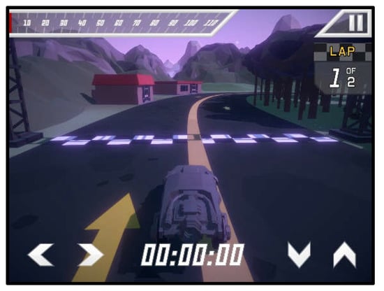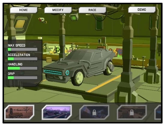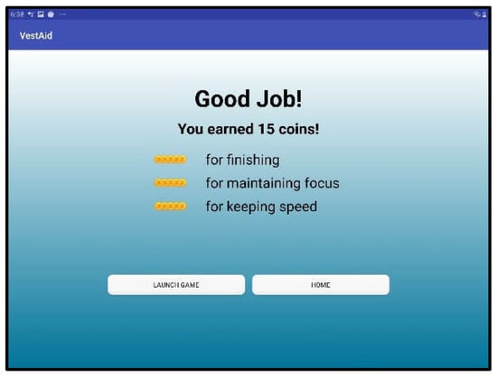 Since the VestAid technology is designed for the primary user population of post-concussion service members and athletes, a reward-based system with a car racing game component was designed. The racing game opens to a garage where the patient can spend the coins awarded based on their exercise performance to customize their racecar (Figure 8). The goal of each race is to finish in the shortest possible time (Figure 9). Patients gain access to the racing game by completing their required daily VORx1 exercises. For each day of completed exercises, patients will unlock a new functional upgrade or track in the game. Functional car upgrades make it easier to achieve the timing goals in each track. PTs can disable game functionality if they feel it will negatively affect a patient’s therapy. The goal of the game feature in the app is to provide a reward but it also serves a therapeutic purpose. When driving, the user is required to use smooth pursuits and saccades, and is exposed to visual backgrounds that can serve as a form of habituation training for the person living with dizziness.