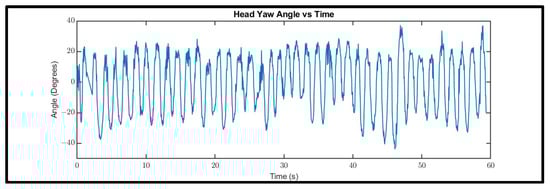 The head angles oscillate between two extremes, represented by peaks and valleys in the curve. If the head movements are performed uniformly with exactly the same amplitude and frequency, the head angle waveform would be a perfectly periodic curve with the period equal to the period of head movement and the amplitude equal to the amplitude of the head movement (maximum head angle displacement from the neutral position, in which one’s head has zero yaw angle). In reality, the motion is not perfectly periodic as the subject’s slightest change in head movement speed will cause changes in the peak-to-peak (valley-to-valley) time, which represents the time of a left-to-right-to-left (or right-to-left-to right) head movement.