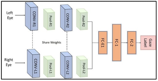 To determine eye-gaze compliance, we used a light-weight deep learning-based method that is able to run on a regular tablet or smartphone without the need for a graphics processing unit (GPU). We developed a convolutional neural network (CNN)-based module for classifying the eye-gaze direction as “on-target” or “off-target” based on the work of []. Figure 12 shows the original architecture of the neural networks that employs convolutional layers followed by fully-connected (FC) layers.