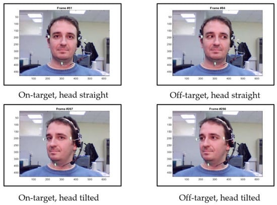 To train the network, a public dataset [] of videos of 10 persons conducting head and eye motions similar to VORx1 exercises was used. Frames from the videos were extracted and labeled as “on-target” and “off-target” based on whether the gaze was directed towards the target regardless of head orientation (Figure 13). Left and right eye images were used as the network input and the output is the binary classification result.