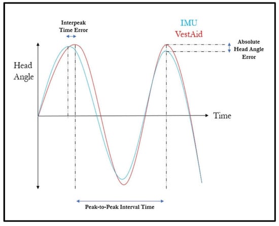 For each trial, the VestAid system was set to run for 30 s at 80, 120 or 160 bpm. The subject followed the system’s metronome as closely and as smoothly as possible and completed at least a 30-degree head sweep (+/− 15 degrees) for each head turn. Data recording with the IMU began when the head alignment countdown reached 5 s remaining and stopped once the exercise was completed. Five trials were completed at each target bpm for each direction (horizontal/vertical) for a total of 30 trials. The IMU and VestAid data were manipulated to the output head angle at timepoints of interest (details outlined in Supplementary Materials, Section S2 [,].). To quantify the accuracy of the head angle from the VestAid signal, the timepoints and their corresponding head angles from the VestAid signal were then compared to their matching timepoints on the IMU-derived signal to calculate the absolute error in head angle (Figure 15).