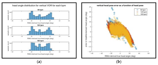 (a) IMU-derived head angle distribution for all trials of vertical VORx1 exercises at different bpms; (b) error in the vertical head pose angle vs. IMU-derived head angle.