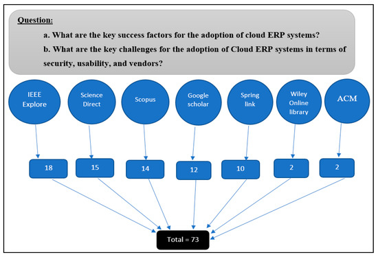 The SLR methodology encompassed all empirical studies with respect to the CSFs of cloud ERP adoption in organisations. The study chose research articles that looked at CSFs for cloud ERP adoption. The search string utilised advanced research to confirm relevant articles. The keywords defined key success factors for cloud ERP systems and challenges related to security, usability, and vendors for cloud ERP systems in all the databases mentioned above. The following keywords were used to search all databases: factors and determinants, cloud ERP, CSF, Special issue, security issues of cloud ERP, usability issues of CERP, vendors issue of CERP, cloud ERP adoption, and other related words such as implementation, adoption, and diffusion. The program yielded 73 research publications in total, spanning the years 2011–2020 (see Figure 2).