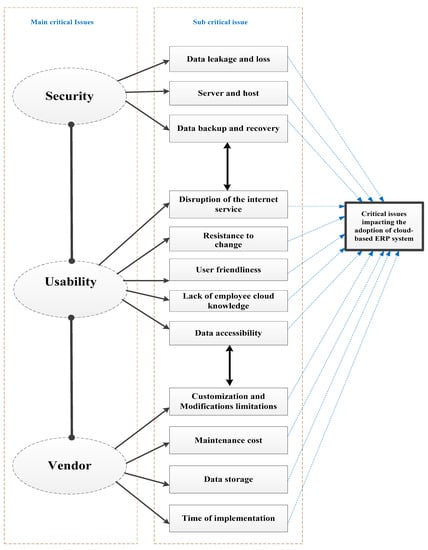 Another source of concern discovered in the literature is connected to the usability of cloud ERP systems. Unsurprisingly, usability issues are top issues that might have a negative impact on the adoption of CERP [17,38,53]. According to the study in [74], 20 experts cited CERP system usability as a significant element in adopting ERP under a SaaS delivery model. Moreover, customers frequently made enquiries about the user interface, such as “is the user interface usable?” or “Is the UI the same as it is for on-premises solutions?” experts also stated that the client would like to “move to a more comfortable environment” and that the system should be “easy to use and intuitive”. According to experts, each time incorrect data is entered into a database, customers suffer. This finding confirms the findings of Almajali et al. and Nwankpa [75,76] that usability and user satisfaction improve overall organisational performance. It also concurs with many other academics that see usability as a crucial success component of the entire CERP project and the intention of businesses to utilise ERP software. When a company transitions to a cloud solution, usability issues with regard to cloud technology may face internal staff, which can cause obstacles such as security, customisation, resistance, and so on [67]. A lack of understanding is a significant challenge, and as a result, users face numerous difficulties throughout the adoption phase of cloud enterprise systems [19].