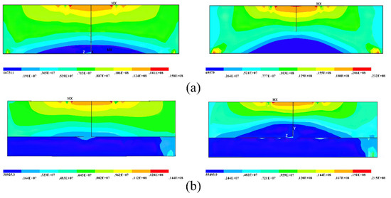 Figure 4 shows the stress cloud of single-layer lining and double-layer lining segmental joints at the fifth and tenth load steps when the axial force is 10,000 kN. It can be seen that the single-layer lining and the double-lined segmental joint have a similar stress failure process. In other words, from the whole cross-section compression, the bolt is not under force; the compression area continues to move up, and the bolt participates in the force. At that time, the triangular stress zone appears in the lower part of the concrete under the tension of the bolt until the uppermost concrete reaches the yield compressive strength, or the stress concentration at the bolt hand hole exceeds the compressive strength of the concrete. Figure 5 shows the relationship between the stress of a node around the concrete compression zone and the loading time under the two lining modes. Although the double lining increases the thickness of the segment, the improvement of the overall ultimate bearing capacity of the segment is limited. It can be considered that the double-layer lining structure only plays a role in preventing tunnel leakage and lining corrosion. Yan et al. [28] believed that after the surrounding pressure of the shield tunnel is stable, the load is all directly applied to the primary lining segment. Therefore, the primary lining segment does not transfer the external force to the secondary lining without a particular load. That is, the double-layer lining only plays an auxiliary role. However, the conclusions of this paper mainly prove that the secondary lining contributes little to the bearing capacity of the joint and does not mean that the secondary lining has a weak effect on the overall mechanical properties of the shield tunnel.