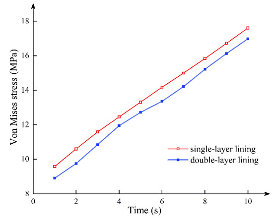 Stress–time curve of single-layer lining and double-layer lining at a node around the concrete compression area.
