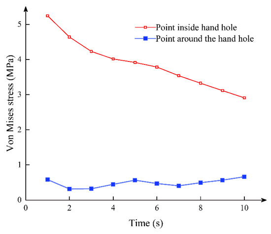Stress–time curve of internal nodes and surrounding nodes of the hand hole.