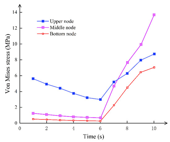 Figure 6 shows the stress state of the joint in the fifth and tenth load steps. As shown in Figure 7, in the early stage of stress, the stress of the hand hole internal node is much larger than that of the surrounding node. With the increase of stress time, the stress of the hand hole internal node gradually decreases. During the entire section compression stage, the stress concentration at the hand hole is large because of the high axial pressure. In addition, an extrusion effect can be seen in the stress condition. The concrete on one side of the joint bolt is opened as the positive bending moment increases, reducing the stress concentration effect of the hand hole.