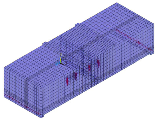 The size of the rectangular hand hole is 200 mm × 80 mm × 160 mm. The bolt used is an 8.8-grade M24 high-strength bolt with a yield strength of 640 MPa and a diameter of 27 mm. Water and soil pressure is the axial force exerted on the segment. The horizontal axial force loading ranges from 10,000 to 20,000 kN, and the load increment value is 2000 kN. There are six groups of axial-force-loading conditions. The vertical force load increases by 200 kN each time until the concrete of the joints crushes, or the bolt pulls out. The loading diagram of single-layer lining and double-layer lining is shown in Figure 2. Figure 3 shows the meshing diagram of the single-layer lining segment. The parameters of the double-layer lining segments are similar to those of the single-layer lining. However, the thickness of the double-layer lining section exceeds that of the single-layer lining segment by 350 mm.