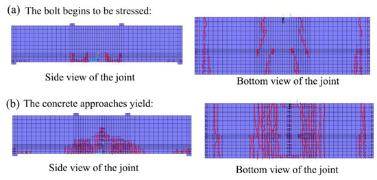 Figure 9 shows the formation of concrete cracks under an axial force of N = 10,000 kN. At the beginning of the joint under force, the joint cracks first emerged at the point of stress concentration and extended lengthwise from both ends of the short side of the hand hole. Because of the restriction effect at the support, lateral cracks appeared outside the section. With the gradual transfer of the stress concentration area after the segmental joint is opened and the bolt begins to bear the strain, the form of the crack also changes. The vertical cracks generated by the pulling force of the hand hole begin to form on the side of the joint as the tension carried by the bolt increases, as shown in Figure 10a. Cracks extending to the edge of the segment appear at both ends of the hand hole, and the development direction of the crack is n t perpendicular to the side of the segment but exhibits an angle of about 30 degrees. As shown in Figure 10b, before the concrete in the compression area is close to yielding, the bolt has a huge stress concentration effect on the concrete, leading to tensile failure of the concrete near the hand hole. The longitudinal crack is localized around the hand hole and propagates to the bottom of the joint.
