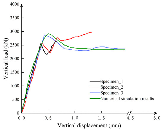 The crack distribution in simulation is consistent with the scaled experiment test by Wang et al. [29]. Figure 11 shows that under different axial forces, the displacement curve of the numerical simulation is basically consistent with the displacement measured in the actual experiment, which proves the reliability of the numerical model.