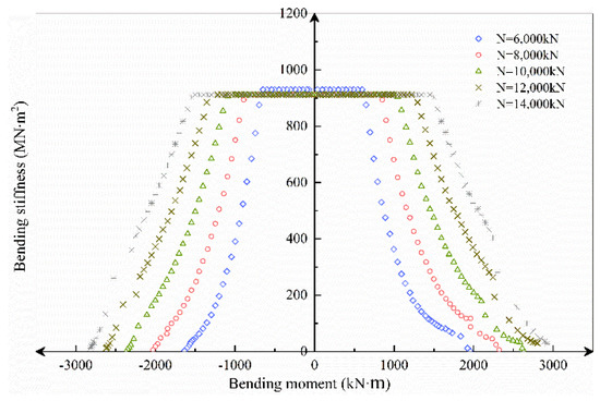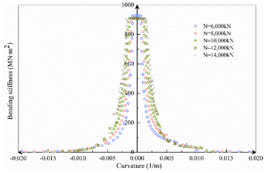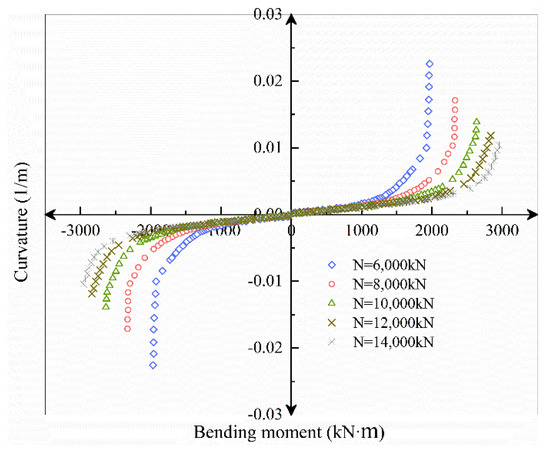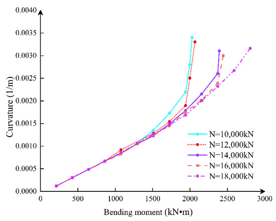 The axial load range selected in this section is N = 6000~14,000 kN, increasing at a rate of 2000 kN. According to the axial load, M–ϕ, Kθ–M, Kθ–ϕ and curves under different axial force conditions are obtained by the theoretical analysis model, as shown in Figure 16, Figure 17 and Figure 18.