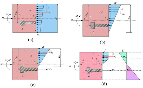 The boundary conditions to be satisfied in this stage are , , , and . In addition, when , the concrete is directly crushed, and the segment loses its bearing capacity.