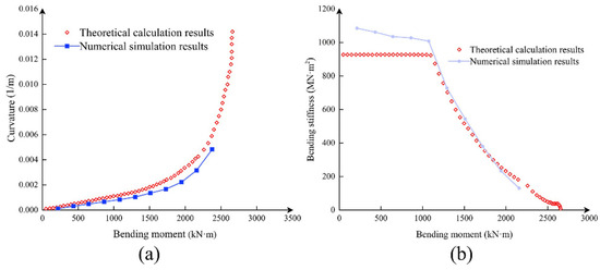 Comparison of M–ϕ (a) and Kθ–M (b) curves between the theoretical calculation and numerical simulation (N = 10,000 kN, positive bending moment).