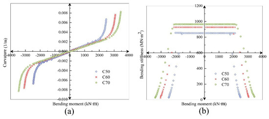 It can be seen from Figure 19 that under the condition of large axial force, the bending stiffness also increases with the increase of concrete strength. Before the joint is opened, the concrete strength has little effect on the bending stiffness; after the joint is opened, the influence of the concrete strength on the bending stiffness is significantly increased, especially for the joint stiffness from C50 to C60. The influence of increased concrete strength is diminished again as bolt tension increases. In conclusion, the sensitivity of the influence of the increase of concrete strength on the flexural bearing capacity and flexural stiffness of the joint is positively correlated.