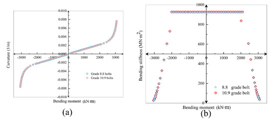 Comparison of M–ϕ (a) and Kθ–ϕ (b) curves of grade 8.8 and 10.9 bolts (N = 20,000 kN).