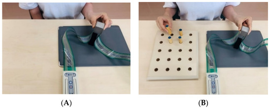 The subjects were seated in a chair, and the height of the front table was adjusted. A cubic object made of iron (250 g, 31 × 31 × 31 mm) was on the table, 30 cm from the participants in the median sagittal plane. In order to decrease the difference between individuals in digital skin friction, the fingertips were wiped with alcohol-soaked cotton. The experiment consisted of a single task (ST) and a dual task (DT) session (Figure 1). In the ST, the experimental procedure was based on Westling and Johansson [12]. The instruction given to the participants were as follows: (1) grip the object with the thumb and index finger, (2) lift it at a height of about 5 cm, and (3) hold it for about 5 s. In the DT, a pegboard was placed on the table next to the cubic object and four pegs were used. The instructions were as follows: (1) grip the object with the thumb and index finger, (2) lift it at a height of about 5 cm, and (3) invert all four pegs using the other hand while holding the object. In both tasks, we required the participants to execute the task using minimum force. On the other hand, we did not ask the participants to focus on one task more than the other in the DT. Each session was repeated 10 times for the dominant and non-dominant hand, and an interval of 5 s was given. The testing order for the dominant and non-dominant hand was randomized.