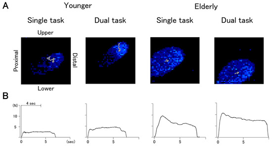 One of the key findings in this study was that the trajectory of the COP decreased, while the GF increased in the dual motor task in both younger and older groups. This means that the safety strategies responding to dual task interference are universal regardless of age. The effect of dual task interference on a precision grip task has been described primarily in temporal and dynamical parameters. Regarding the temporal parameters, previous studies have reported that the preload phase (time between first contact of the fingertips with the object and onset of the load force) or the lift phase (time for the object to be lifted and stabilized) increased in the dual task [31,32]. Moreover, in the dynamical parameters, increased maximum GF or mean GF in the hold phase in the dual task were reported [31,32,33]. Changes in these parameters may be due to sensorimotor processing for precise grasp control being interfered with by increased information load. In contrast to the numerous studies adopting motor-cognitive dual tasks, studies with dual motor tasks, especially focusing on bimanual interference on precision grip, are limited. It is only known that performing a lifting or tapping task with one hand increased the GF of the other hand during object lifting [10]. Competition for processing resources between tasks may have prevented proper allocation to the precision grip-lift task, resulting in an increased safety margin to prevent the object slipping. In the present study, we observed increased GF in the dual task, and this is consistent with previous studies. On the other hand, it is the first to describe changes in the finger COP trajectory. The results suggest that the safety strategy is even applied to increased processing load, in addition to decreased sensorimotor control with aging.