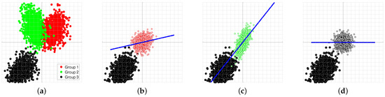 The “unknown” data, shown in black, are repeatedly projected on the spaces spanned by the eigenvectors of other groups. When the principal axis of the projected data aligns with the reference axis, a match is declared. In this example, the source of the unknown data is the group shown in black. (a) Three multivariate normal data sets simulating different signal sources, (b) Black data is whitened by the red whitening matrix, (c) Black data is whitened by the green whitening matrix, (d) Black data is whitened by its own whitening matrix.