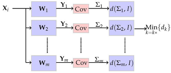 To illustrate this point, three multivariate normal populations are created and shown in Figure 1a. The 3rd data set (in black) is used as the “unknown” source and is repeatedly projected on . After each projection, the scatter diagram is plotted and shown in Figure 1b–d. When the data from group 3 is whitened by , Figure 1b, the major axis of the projected data appears at an angle to the principal axis of the projection matrix. This indicates that the data and the whitening matrix are mismatched. Repeated projections produce Figure 1b–d. It is only in Figure 1d that the whitening transformation produces a circular scatter diagram. The projection that produces the least correlated data identifies the brand. This property indicates that the source of the unknown data matches the whitening transform of group 3. The detector can be implemented as a bank of parallel matched filters shown in Figure 2.