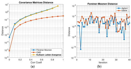 There are any number of metrics to measure the distances between two symmetric, positive definite covariance matrices. They include KL divergence, Euclidean distance, squared Frobenius norm, Bhattacharyya distance, Bregman matrix divergence and LogDet [50], among others. In this work we use the Förstner-Moonen metric [49] as a similarity measure of two covariance matrices. As a point of reference, the well-cited Correlation Matrix Distance(CMD) metric [51] and the Kullback-Leibler measures are studied. There is no one definition for similarity but three are monotonic with correlation and hence are valid measures. We have superimposed CMD, KL and Förstner-Moonen plots for comparison. The graphs appear later on in Figure 3a. As expected, the pairwise distance increases with increasing correlation, meaning that the covariance matrix of correlated variables is at farther distances from a diagonal covariance matrix. It is noteworthy that the KL measure is virtually coincident with the Förstner-Moonen metric hence justifying its use as a similarity index.