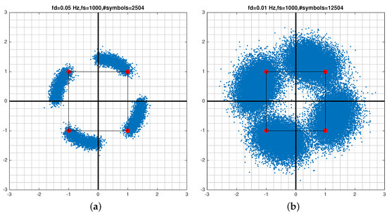 Constellation smearing caused by time-varying phase offset under two SNR values. (a) SNR = 20 dB, (b) SNR = 10 dB.
