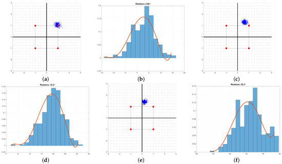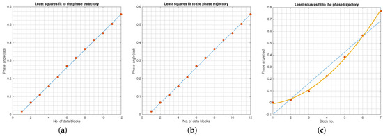 Figure 5 shows the process by which instantaneous phase values are gathered and used in the model fitting step. This step can also be explained as the sampling of the phase curve. The symbol phases per block are histogrammed followed by fitting a polynomial. The peak of the polynomial is for the kth block. This step is repeated over multiple blocks and shown in Figure 5a–f. The estimated phases define the linear phase trajectory the slope of which determines . Figure 6 is the least squares fit of the phase model to the data. Figure 6a,b correspond to SNR = 20 dB and 10 dB, respectively. Figure 6c illustrates that a nonlinear phase trajectory can be modeled and tracked as well. The estimated and at SNR = 20 dB and 10 dB, respectively. The true offset frequency is 0.05 Hz.
